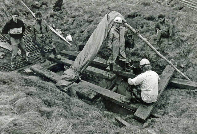 Figures Present: Martin Rowe(standing, no helmet), Malcolm Cotter (standing, white helmet), Julie Hesketh (under MC's arm!) James Allen (dark hair, sitting on bank) and Joe Frampton (sitting on timber)