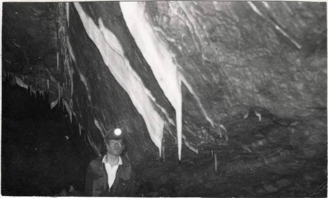 Title/Subject: Bill Smith posing in front of calcite stal curtain in NHASA gallery, Manor Farm Swallet.